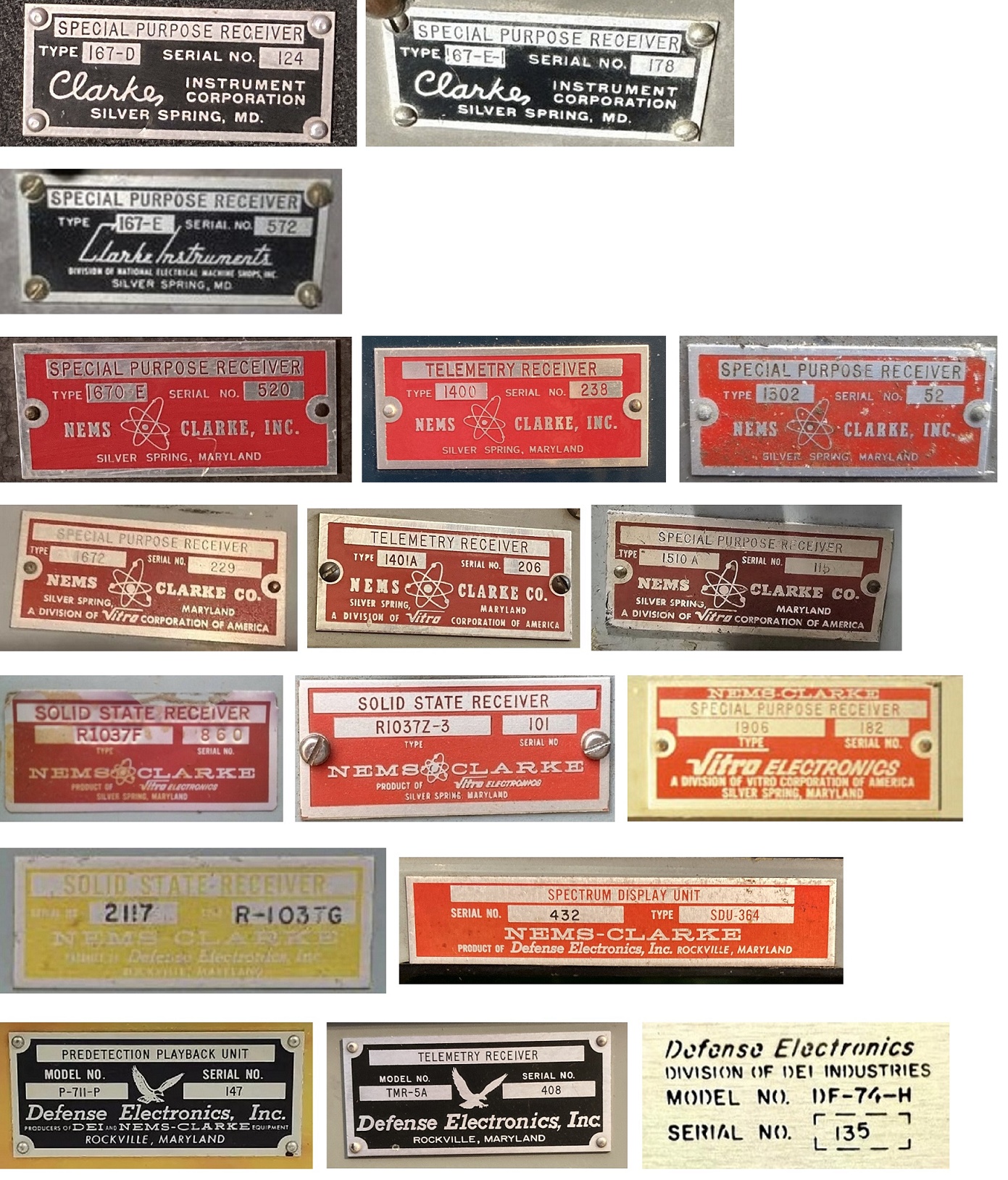 Row 7: Defense Electronics, Inc., Circa 1963. Defense Electronics, Inc. producers of DEI and NEMS-CLARKE equipment, Circa 1967. Defense Electronics division of DEI Industries. Late 1960’s (perhaps 1969, when DEI was sold to an investor).