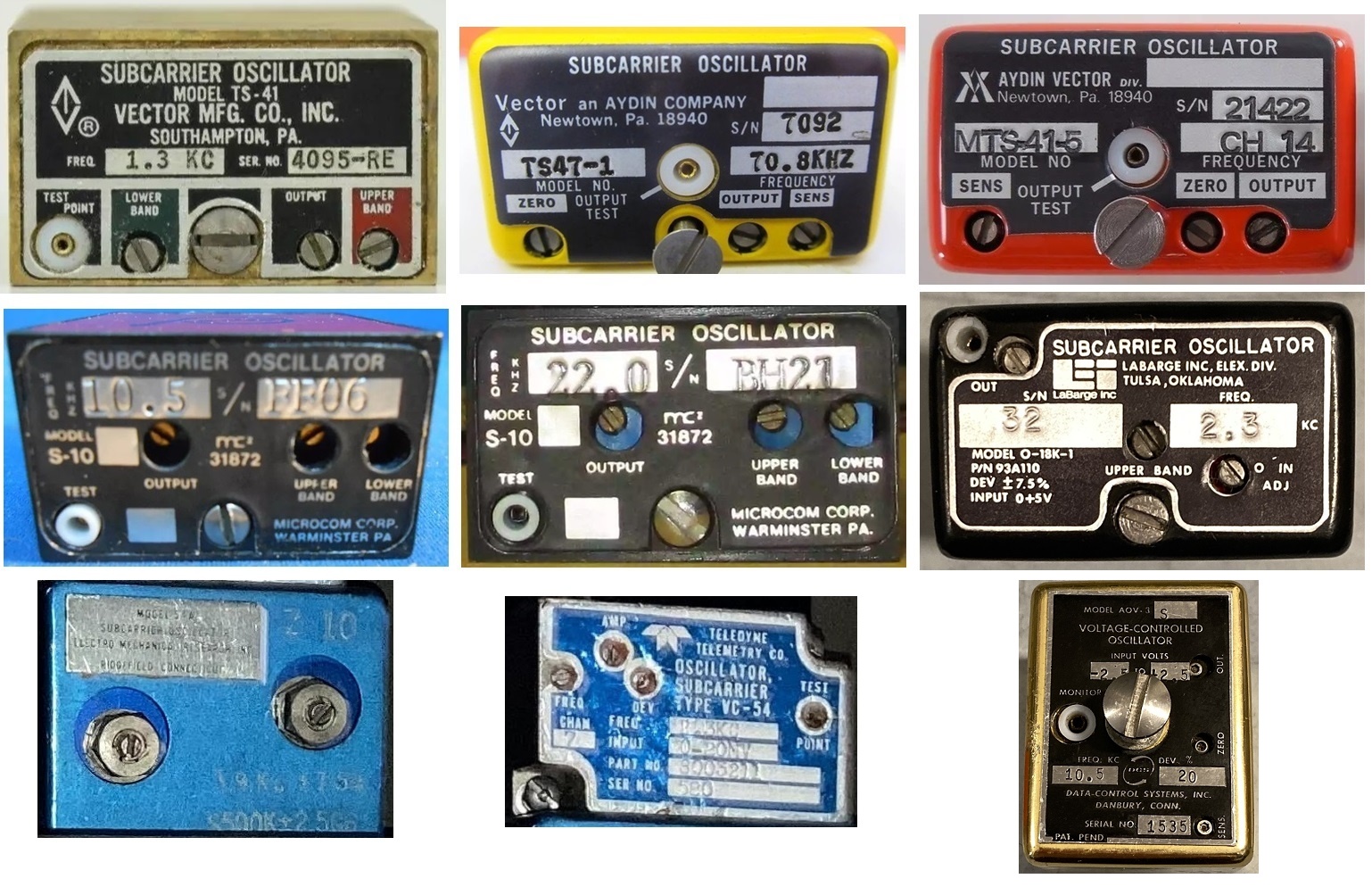 A subcarrier oscillator (SCO) is simply an audio oscillator that can be linearly frequency modulated by a control voltage. The typical design is a multivibrator oscillator (with VCO capability), followed by a bandpass filter to reduce harmonic output. The FM deviation is +/- 7.5% with an input from 0 to 5 volts. During the 1960’s, the form-factor, connector (DB-9), and pinout was standardized across various makers. [However, ] A spacecraft telemetry “package” would include a chassis with positions for several (or many) SCO’s, driving one (or several) FM transmitters.