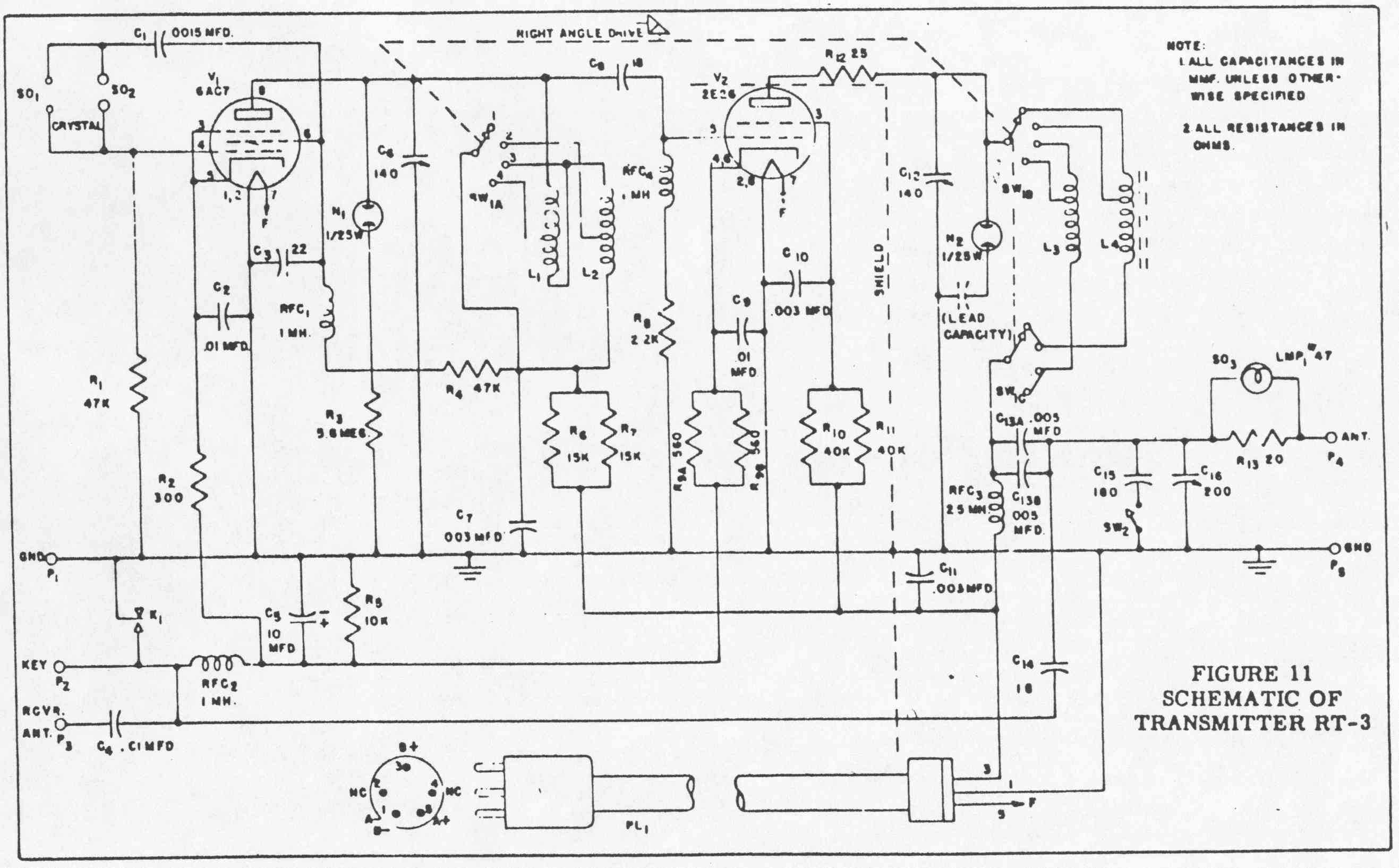 Transmitter RT-3. Tunes 3-22 MC, crystal controlled, accepts crystals with 3/4" pin-spacing (i.e. FT-243), or 1" pin-spacing. Requires 450 volts DC, and 6.3 volts AC or DC power.