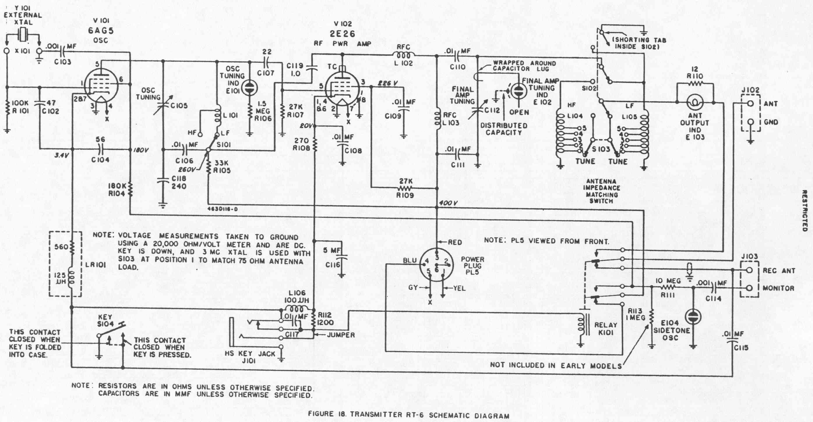· RT-6XX: Parts associated with the keying relay, sidetone oscillator, and receiver antenna connection have been removed. The external key jack is 2-contact, instead of 3-contact. The 2E26 power amp is no longer keyed – the cathode resistor is tied directly to ground. Only the oscillator is keyed. Capacitor C119 on the 2E26 plate circuit has been removed. The final neon tuning lamp is now connected via a small capacitor, instead of a ‘gimmick’ wire.
